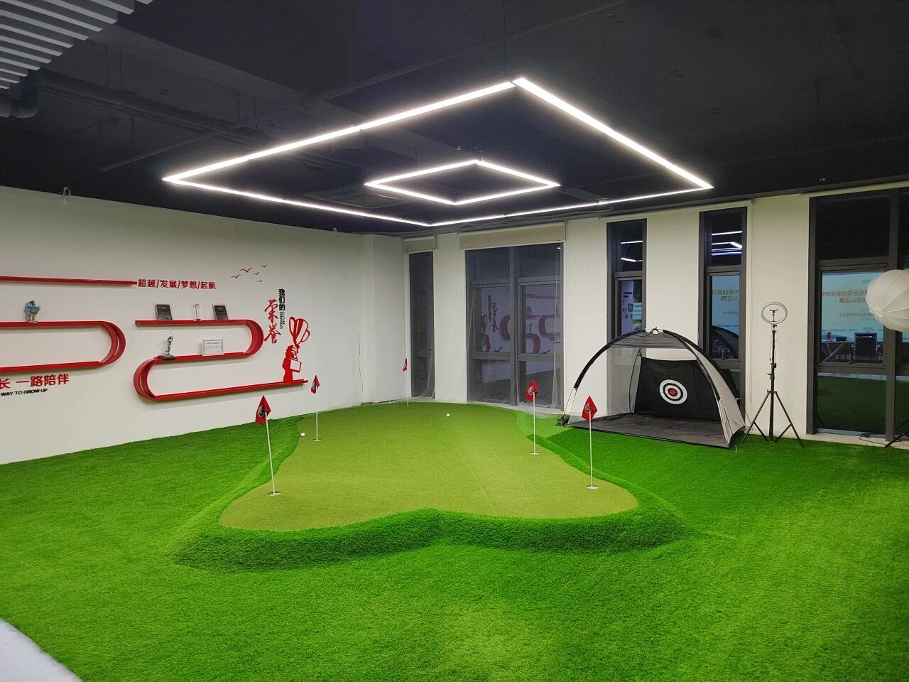 此外,球館內(nèi)還設(shè)有室內(nèi)仿真果嶺和體能訓(xùn)練室,為球友提供更全面的服務(wù)。